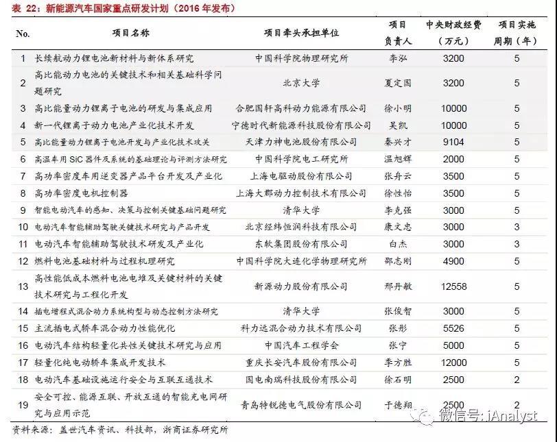 科技部于2016年6月30日制發(fā)了《關于對國家重點研發(fā)計劃“新能源汽車”等10個重點專項2016年度項目安排進行公示的通知》,在新能源汽車領域有19個重點項目入選,涉及智能化、輕量化、動力電池性能改進、長續(xù)航、數(shù)據(jù)網(wǎng)聯(lián)等方向,如表22所示。其中,與鋰電池相關的項目有5個,主要以提高能量密度為目標,電池制造商國軒高科、寧德時代和力神,分別牽頭承擔了其中的3個項目。