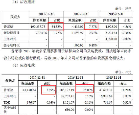 值得一提的是,寧德時代除了給普萊德享受售價“折扣”,還給其很大比例的賒欠結(jié)算貨款方式,2016年普萊德的應收賬款占比約25%,約為18億元,2017年對其應收票據(jù)占比約為35%,金額約為19億元。