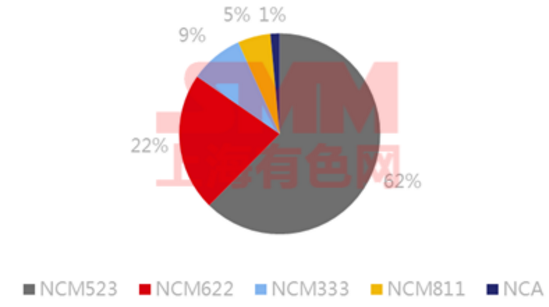 據(jù)上海有色網(wǎng)據(jù)SMM調研數(shù)據(jù),我國動力電池三元材料以5:2:3的鎳鈷錳配比居多,6:2:2的占有一定的市場份額,但是更高配比的8:1:1卻顯得十分稀少。