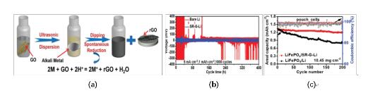 (圖1 SR-G/Li負(fù)極的制備機(jī)理示意圖(a)、5 mA˙cm2下循環(huán)性能(b)及LiFePO4電池1C循環(huán)性能(c))