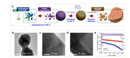 (圖2 富鋰錳(LLO)/尖晶石(S)復(fù)合材料合成過程(a)、外延結(jié)構(gòu)(b/c/d)及其1.0 C循環(huán)性能(e))