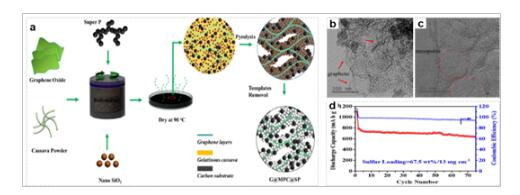 (圖3復(fù)合層次孔炭(G/MPC/SP)構(gòu)筑流程(a)、微觀結(jié)構(gòu)(b/c)及其載S正極的電化學(xué)性能(d)