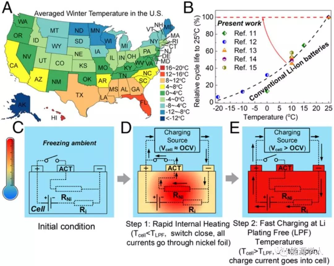 圖1. 實(shí)現(xiàn)不受溫度影響的快速充電基本思路。A) 美國(guó)各個(gè)州的冬季平均氣溫;B) 現(xiàn)有文獻(xiàn)中,不同溫度下循環(huán)壽命的相關(guān)數(shù)據(jù)(以25 ºC進(jìn)行歸一化處理);C-E) 用于無(wú)鋰沉積電池的快速充電可控單元結(jié)構(gòu)的原理示意圖。