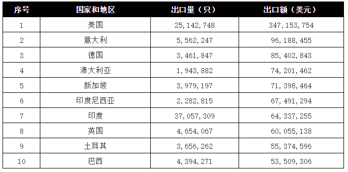 2、2017年鋰一次電池出口前十大目的地(按出口額排序)