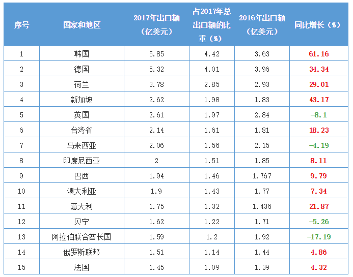 4、印度,繼越南之后,成為2017年增長較快的市場,2017年出口印度金額約為6.62億美元,占中國出口總額約5%,2016年出口印度金額約為5.22億美元,同比增長約26.82%,是近兩年來增幅較大的市場。
