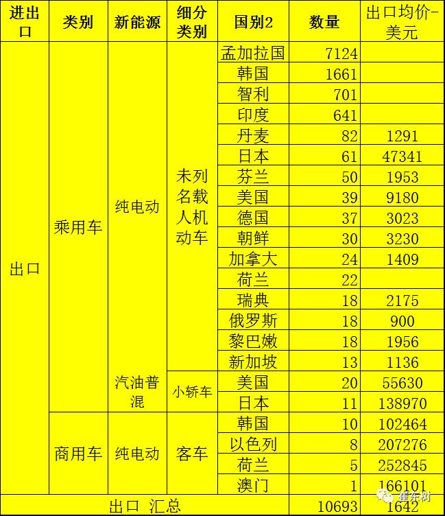 17年6月的新能源乘用車出口主要是孟加拉、韓國、美國、印度等市場,部分小于4位數(shù)的出口單價就不寫上為好。由于總體單價在1642美元,檔次不是很高。