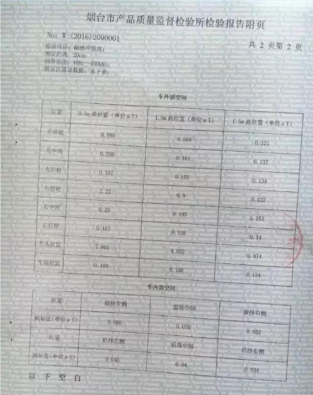上圖為煙臺市產品質量監(jiān)督檢測所對中惠創(chuàng)智無線供電技術有限公司7.7kW無線充電樁磁感應強度檢測的檢測報告。