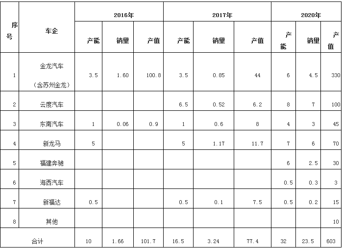 金龍汽車集團(tuán)加快推動投資30億元的龍海大中型客車新基地一期項(xiàng)目建設(shè),加強(qiáng)客車整車研發(fā)與市場推廣,提高品牌影響力和市場競爭力。到2020年,新能源客車(含蘇州金龍)產(chǎn)能達(dá)到6萬輛,銷售4.5萬輛,實(shí)現(xiàn)產(chǎn)值330億元,并帶動省內(nèi)客車零部件產(chǎn)業(yè)鏈發(fā)展。