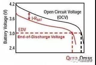 用數(shù)據(jù)說(shuō)話,下圖表示一電池放電曲線,X軸表示放電量,Y軸表示電池開(kāi)路電壓,電池理想放電狀態(tài)為黑色曲線,紅色曲線是考慮到電池內(nèi)阻時(shí)的真實(shí)狀態(tài)。