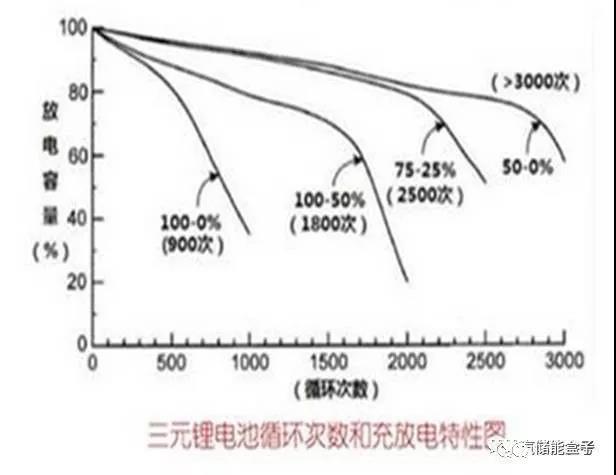 上圖為一三元鋰電池的充放電特性圖,可以看出,不同的充放電方式對(duì)電池的壽命影響不一樣,如上圖數(shù)據(jù),以25%-75%充放電的壽命可以達(dá)到2500次,即我們所說(shuō)的電池淺充淺放。電池壽命這個(gè)話題我們以后還會(huì)深入討論。