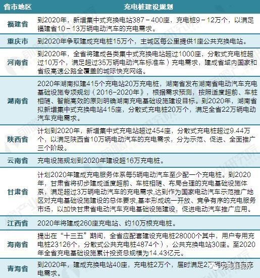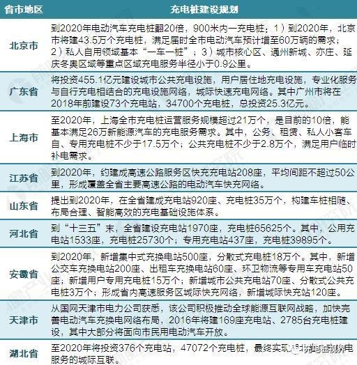 根據(jù)前瞻產(chǎn)業(yè)研究院發(fā)布的《2017-2022年中國電動汽車充電樁行業(yè)發(fā)展前景預(yù)測與投資戰(zhàn)略規(guī)劃分析報告》統(tǒng)計,目前有20余個省市發(fā)布了電動汽車充電樁規(guī)劃,匯總?cè)缦拢?/div>