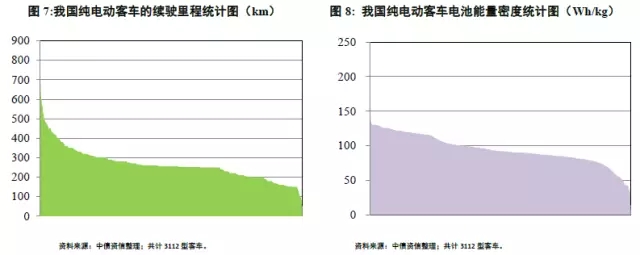 其中,最長續(xù)駛里程車型達(dá)到892km,該車整車質(zhì)量14,900kg,動力電池質(zhì)量達(dá)4,310kg,僅次于所有車型中4,500kg的動力電池最高質(zhì)量,電池能量密度91.4Wh/kg。從動力電池的能量密度角度看,目前乘用車選用的動力電池分布在13.8Wh/kg~237.9Wh/kg范圍內(nèi)(不含采用超級電容的3型客車),同時(shí)僅有4款車型的能量密度超過150Wh/kg,眾數(shù)值100.0Wh/kg,中數(shù)值92.0Wh/kg;大多數(shù)車型的能量密度集中在80~120Wh/kg的范圍。由于客車可以容納更大質(zhì)量的動力電池,因而客車對于電池能量密度需求的范圍彈性較大。
