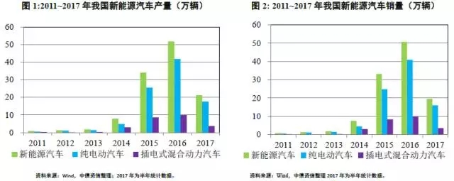 由于新能源汽車所受到的政策傾斜、財(cái)政補(bǔ)貼和優(yōu)先配置等實(shí)際便利,從2014年開始,特別以一線城市對新能源汽車的需求增長為契機(jī),我國新能源汽車市場開始快速增長。如圖1和圖2所示的新能源汽車的產(chǎn)銷情況,2011~2013年市場規(guī)模非常小,發(fā)展較慢;從2014年開始明顯增快,到2016年,我國新能源汽車產(chǎn)量51.7萬輛,銷量50.7萬輛,基本實(shí)現(xiàn)了前述《規(guī)劃》所設(shè)定的2015年新能源汽車市場達(dá)到50萬輛的發(fā)展目標(biāo),但相比同期我國汽車市場總體2,811.88萬輛和2,802.82萬輛的總產(chǎn)銷量規(guī)模,新能源汽車這一細(xì)分市場的依然十分微小,占比不足2%。