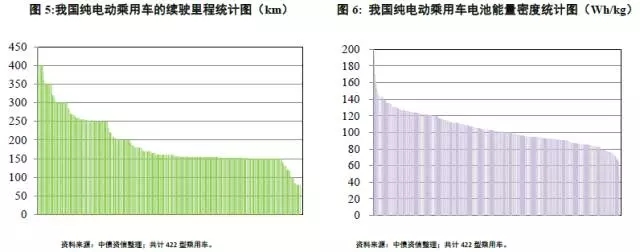 乘用車方面,現(xiàn)階段422型車的續(xù)駛里程從80km~450km不等,最多數(shù)的車型續(xù)航里程眾數(shù)值155km,中數(shù)值160km,基本能達(dá)到《規(guī)劃》的發(fā)展目標(biāo);僅有48型車的續(xù)駛里程在300km及以上。其中,有2型車?yán)m(xù)駛里程達(dá)到450km,該2型車的質(zhì)量均為2,450kg,動力電池質(zhì)量730kg,能量密度124.7Wh/kg。從動力電池的能量密度角度看,目前主要分布在50.5Wh/kg~199.4Wh/kg范圍內(nèi),眾數(shù)值94.4Wh/kg,中數(shù)值101.3Wh/kg,同時(shí)僅有7款車型的能量密度達(dá)到《規(guī)劃》關(guān)于2015年達(dá)到150Wh/kg的目標(biāo),大多數(shù)車型的能量密度集中在80~120Wh/kg的范圍。