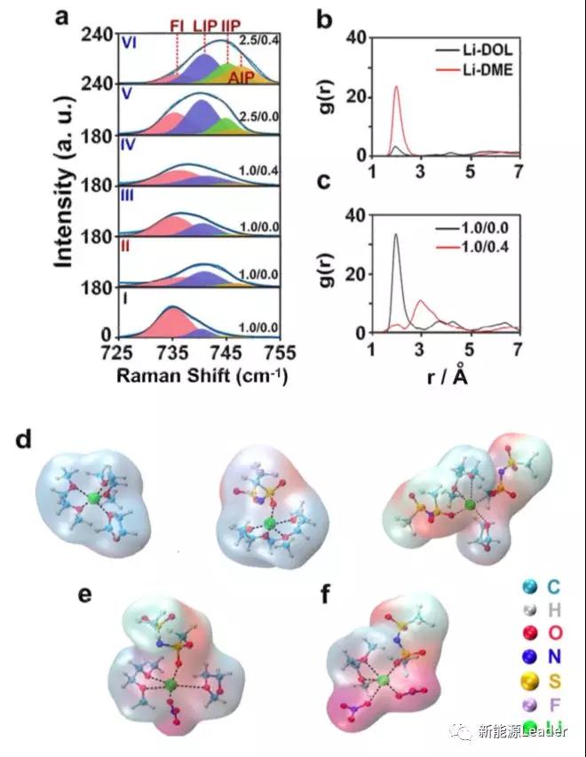 一般而言,我們認為Li+溶解后會形成一個溶劑化的外殼,這個外殼即包含陰離子,也包含溶劑分子。JunMing利用密度函數(shù)理論對分子動力學進行了模擬,得出了溶劑化外殼的結構如上圖所示。模型中Li+與TFSI-中的O具有強烈的相互作用,在溶液中添加NO3-后,NO3-能夠取代溶劑化外殼中的TFSI-(上圖e)或者取代溶劑分子(上圖f),從而達到弱化Li+-溶劑之間相互作用的效果。同時上面的研究也表明溶劑化外殼的結構,不一定需要保持電中性,例如上圖e和圖f就呈現(xiàn)電負性結構,能夠進一步與Li+相互作用,形成更大的結構,從而進一步弱化Li+-溶劑的作用力。