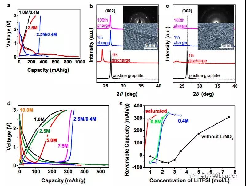 那么究竟是什么原因導致高濃度的LiTFSI電解液能夠顯著改善石墨負極的穩(wěn)定性呢?為此,JunMing分別配置了不同LiTFSI濃度和配方的電解液進行了實驗,結果如下圖所示。從下圖d中可以看到,隨著LiTFSI濃度的提高(從1M到10M),電解液的穩(wěn)定性有了顯著的提升(10M濃度電解液性能下降主要是因為濃度過高,導致粘度上升和離子遷移困難),并且在電解液中加入LiNO3能夠進一步提升電解液的穩(wěn)定性。采用XRD研究顯示,在濃度較高的2.5M/0.4M電解液中石墨能夠可逆的嵌入和脫出Li+,但是在濃度較低的1.0M/0.4M電解液中,由于石墨在溶劑共嵌入的作用下發(fā)生了分層剝落,導致Li+的嵌入不可逆。
