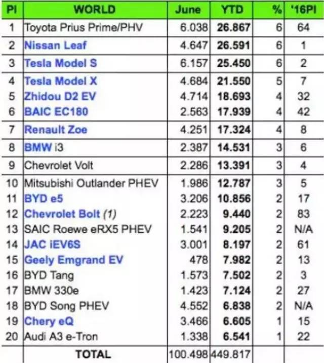全球純電動(dòng)汽車銷量排名,車型排名統(tǒng)計(jì)的是純電動(dòng)汽車和插電式混合動(dòng)力汽車放在一起的結(jié)果,所以上半年全球賣的最好的電動(dòng)車型竟然是豐田的普銳斯,半年2.7萬(wàn)輛。排名第二是日產(chǎn)聆風(fēng),三四名都是特斯拉的,直到第五名才出現(xiàn)國(guó)產(chǎn)品牌車型,而且是知豆D2。