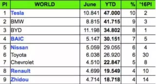再來(lái)看車企排名,第一名當(dāng)然是特斯拉,因?yàn)閮煽钴嚨匿N量都非常高。寶馬排名第二,半年銷量4.2萬(wàn)輛。而比亞迪排名第三,落后寶馬7千多輛。北汽新能源緊跟其后排名第四。前十名里還有一個(gè)自主品牌就是知豆。