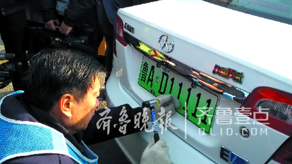 2016年12月1日,工作人員為首副新能源汽車牌照掛牌。(資料片)