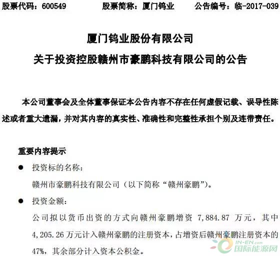 廈門鎢業(yè)擬投7885萬元控股贛州豪鵬 看重電池回收業(yè)務(wù)