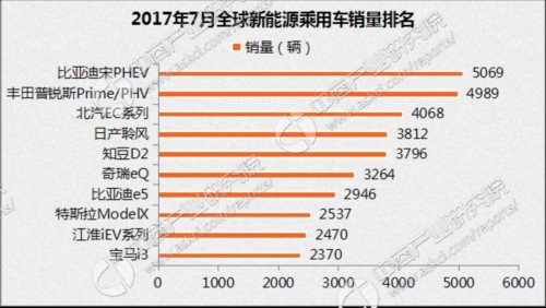 2017年7月全球電動(dòng)汽車(chē)銷(xiāo)量排名依次為比亞迪宋PHEV、豐田普銳斯Prime/PHV、北汽EC系列、日產(chǎn)聆風(fēng)、知豆D2、奇瑞eQ、比亞迪e5、特斯拉ModelX、江淮iEV系列、寶馬i3.