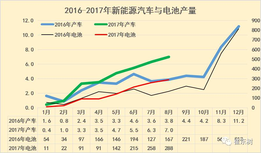 根據(jù)崔東樹(shù)個(gè)人測(cè)算,按照汽車生產(chǎn)合格證數(shù)據(jù):2017年8月新能源汽車產(chǎn)量7萬(wàn)臺(tái),電池裝機(jī)總電量約288萬(wàn)度,同比增長(zhǎng)73%,環(huán)比7月增長(zhǎng)12%。從1-8月的汽車走勢(shì)看是逐步增長(zhǎng)狀態(tài),尤其是在常規(guī)車型持續(xù)低迷的背景下,新能源車持續(xù)環(huán)比增長(zhǎng)是令人振奮的。