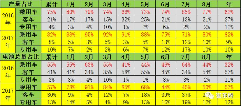 從產(chǎn)量結(jié)構(gòu)的變化看,17年8月的客車用電池占比38%,較16年全年的54%下降較大。但8月的客車占比達(dá)到38%,算是恢復(fù)的較好。乘用車總體看是占產(chǎn)量需求的82%和電池需求的57%,仍是引領(lǐng)消費(fèi)增長(zhǎng)的核心動(dòng)力。但8月體現(xiàn)的客車恢復(fù)較好。