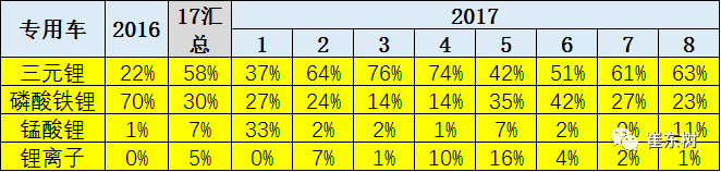專用車的三元化趨勢(shì)很明顯。1-8月的三元電池的裝車量達(dá)到58%的占比,而16年的占比是20%,提升的趨勢(shì)相對(duì)是合理的狀態(tài)。