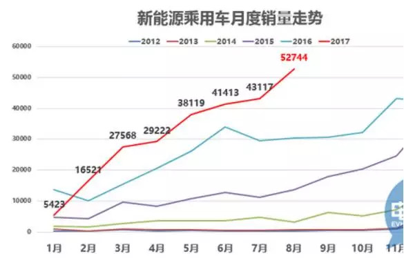 據(jù)乘聯(lián)會的數(shù)據(jù),2017年8月新能源乘用車銷量創(chuàng)有史以來單月銷量新高,達到52744臺,環(huán)比7月增長1萬臺,同比增速72%。