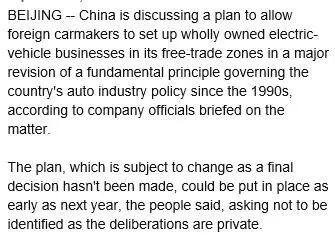 彭博社的一則報道稱,據(jù)消息人士透露,中國正在考慮允許外國汽車制造商在自貿(mào)區(qū)內(nèi)建立獨資電動車業(yè)務,該政策最快將在明年實施。目前的政策下,外國汽車企業(yè)需要和本地企業(yè)建立合資公司。