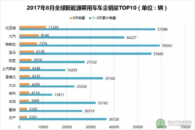 2017年1-8月全球新能源乘用累計(jì)銷量排在前十的車企分別為:特斯拉(59263臺)、比亞迪(57288臺)、寶馬(55683臺)、北汽(44227臺)、日產(chǎn)(36728臺)、雪佛蘭(35162臺)、豐田(32162臺)、知豆(27532臺)、雷諾(26519臺)、大眾(23226臺)。
