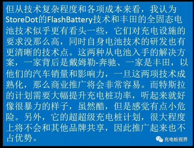 讓我們來(lái)分析片刻,以現(xiàn)在超級(jí)充電樁的功率和充電時(shí)間來(lái)看,如果將來(lái)充電樁功率真的超過(guò)350kW或更高,那么充滿一輛MODEL S所花的時(shí)間,真有可能控制在10分鐘以內(nèi),準(zhǔn)確說(shuō)要把時(shí)間控制在5分鐘這個(gè)檔應(yīng)該問(wèn)題不大。如果達(dá)到這個(gè)速度,那充電就和傳統(tǒng)汽車加油所花的時(shí)間相近了,那么妨礙電動(dòng)車暢行無(wú)阻使用的最后一個(gè)短板也就不存在了。