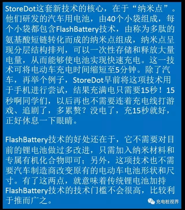 9月份就出現(xiàn)過(guò)一則消息,戴姆勒-奔馳領(lǐng)投了一家以色列初創(chuàng)公司StoreDot,投資6000萬(wàn)美元,用以研發(fā)能夠改變電動(dòng)車充電效率的新型電池技術(shù)。據(jù)稱,StoreDot正致力于研發(fā)一種名為FlashBattery的快充電池,它的充電速度就像它的名字一樣,單次充電只需5分鐘,就能續(xù)航482公里——這一水平,基本已經(jīng)接近一輛傳統(tǒng)燃油汽車進(jìn)站加一次油的效率了。