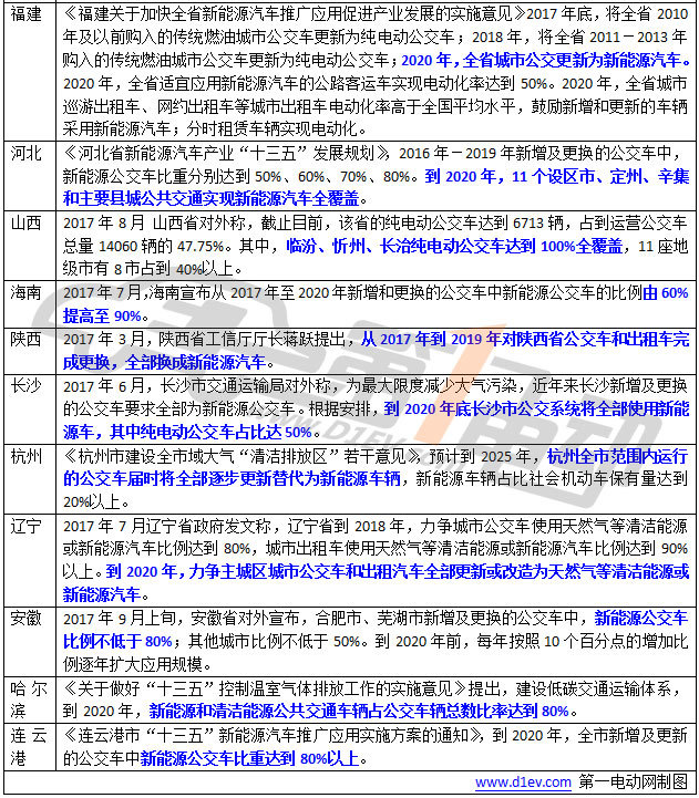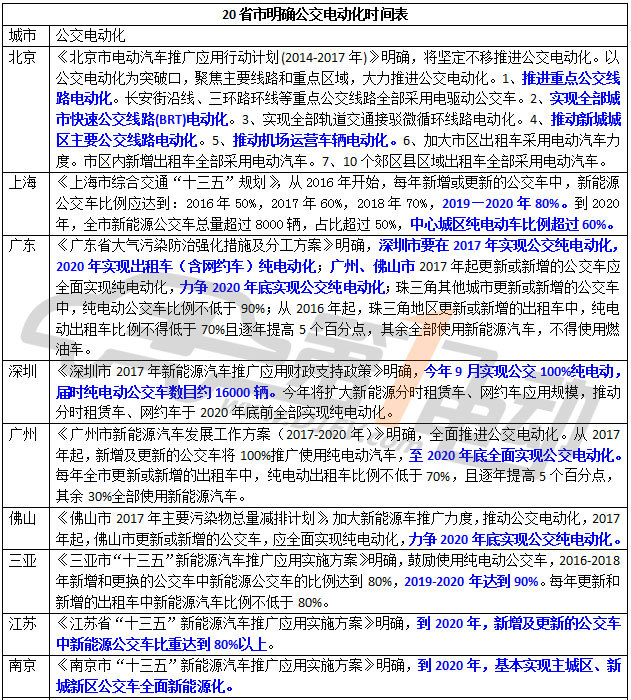 據(jù)第一電動(dòng)網(wǎng)統(tǒng)計(jì),北京、廣東、深圳、廣州、佛山、三亞、江蘇、南京、福建、河北、山西、海南、陜西、長(zhǎng)沙、杭州、遼寧、安徽、哈爾濱、連云港20個(gè)省市明確公交電動(dòng)化時(shí)間表。其中廣東深圳2017年將率先實(shí)現(xiàn)公交電動(dòng)化,廣州、佛山、福建的時(shí)間表為2020年。三亞、江蘇、哈爾濱、連云港等省市到2020年新能源公交車比例達(dá)到80%以上。到2020年南京、河北等省市基本實(shí)現(xiàn)公交電動(dòng)化。