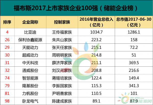 獻禮十九大 | 比亞迪、協(xié)鑫、天能等10家儲能企業(yè)入榜《福布斯》2017上市家族企業(yè)100強榜單,比亞迪居儲能榜