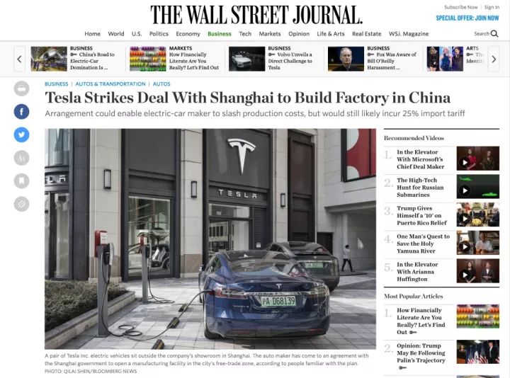 而昨天,美國(guó)著名財(cái)經(jīng)媒體《華爾街日?qǐng)?bào)》獨(dú)家披露了特斯拉已經(jīng)與上海市政府就在上海自貿(mào)區(qū)內(nèi)建立工廠達(dá)成一致意見(jiàn)。