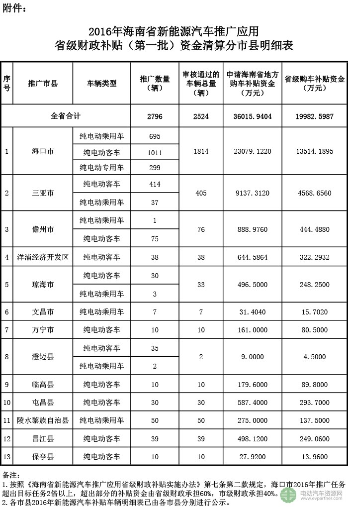 海南省公示2016年海南省新能源汽車推廣應(yīng)用省級(jí)財(cái)政補(bǔ)貼資金(第一批),海南省各市縣累計(jì)推廣數(shù)量2796輛,審核通過(guò)的車輛總量2524輛,擬下達(dá)19982 5987萬(wàn)元。關(guān)于2016年海南省新能源汽車推廣應(yīng)用省級(jí)財(cái)政補(bǔ)貼資金