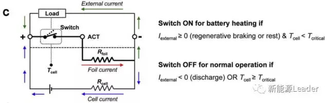 該技術(shù)的核心是自加熱電池,該電池設(shè)計如上圖所示,需要在電池內(nèi)部置入兩片Ni片,每片Ni片的阻抗為78mW,分別放置在電池的1/4和3/4厚度處,兩片Ni片之間以并聯(lián)形式連接在一起,并通過一個開關(guān)與正負極連接在一起,用于控制鋰離子電池的是否加熱。Guangsheng Zhang在上述自加熱電池的基礎(chǔ)上設(shè)計了控制方案,能夠根據(jù)電動汽車的負載情況控制加熱開關(guān)的開啟和關(guān)閉。