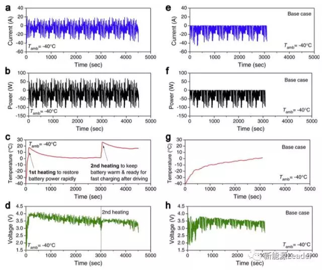 下圖為使用自加熱電池和使用普通電池的對照組在-40℃下使用過程中的電流、功率、電池溫度和電池電壓等數(shù)據(jù)曲線,其中左邊為采用自加熱電池的實驗組,右邊為空白對照組。從電池溫度上看(圖c實驗組,圖g對照組),自加熱電池的溫度升高速度要遠遠快于對照組,實驗組緊緊用了112s就恢復(fù)到了20℃,并且實現(xiàn)了全部的剎車能量的回收,而對照組電池用了3000s,溫度才恢復(fù)到了0℃,從而導(dǎo)致無法回收剎車能量。
