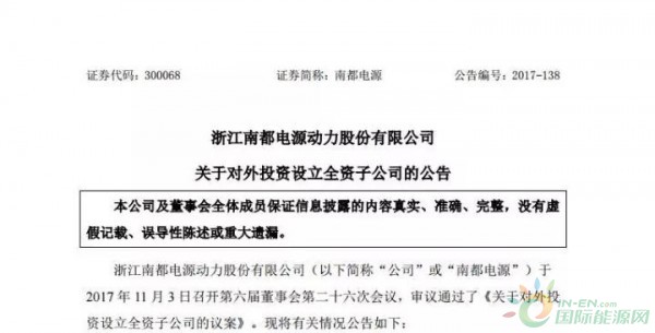 南都電源11月7日發(fā)布公告稱,擬使用自有資金10,000萬元設立全資子公司安徽南都華鉑新材料科技有限公司(以下簡稱南都華鉑新材料),開展鋰電回收及新材料業(yè)務,打通鋰電產(chǎn)業(yè)鏈?! 」骘@示,南都華鉑新材料