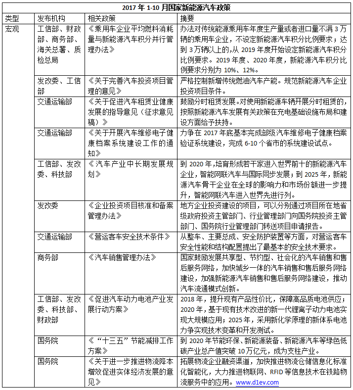2017年1-10月,國(guó)家累計(jì)出臺(tái)32項(xiàng)新能源汽車相關(guān)政策(包括征求意見稿5項(xiàng)),涉及到宏觀、補(bǔ)貼、基礎(chǔ)設(shè)施、安全管理、技術(shù)研發(fā)、智能網(wǎng)聯(lián)等諸多方面。