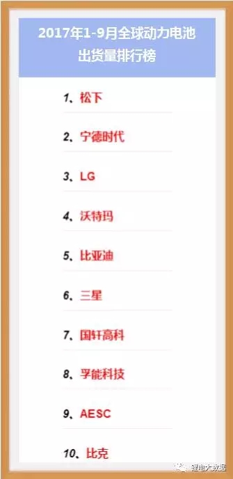 2017年1-9月全球動力電池出貨量排行榜如下: