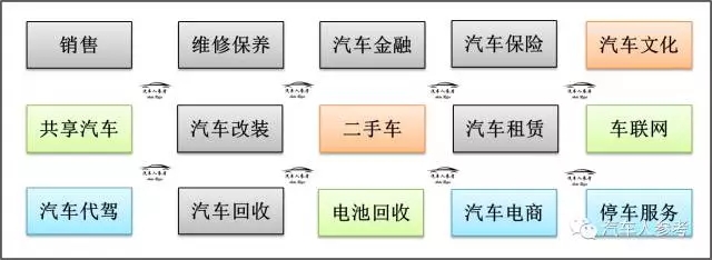 除了傳統(tǒng)的汽車銷售,維修保養(yǎng),我們平時(shí)接觸比較多的汽車保險(xiǎn),汽車金融,汽車租賃等,現(xiàn)在也出現(xiàn)了共享汽車,車聯(lián)網(wǎng)的概念,還有停車代駕等創(chuàng)新服務(wù)也是百花齊放。