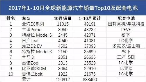 新能源汽車市場的火爆,動力電動市場也水漲創(chuàng)高,下面盤點一下1-10月銷量榜前十車型配套的動力電池,來看看這些幕后的功臣。EV Sales發(fā)布的數據顯示,2017年10月全球新能源銷量增長再創(chuàng)新高,超過12萬輛,達到1
