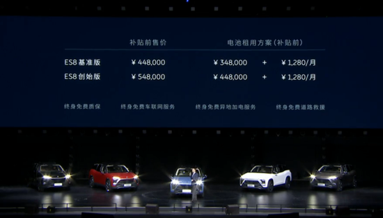 官方信息顯示,ES8基準版補貼前售價人民幣44.8萬元,限量1萬輛的創(chuàng)始版補貼前售價人民幣54.8萬元。而用戶也可以選擇電池租用方案,車價比常規(guī)購買低10萬,每月支付1,280元,同時可享受電池升級服務(wù)。而以北京的補貼力度,基準版補貼后售價為37萬元,如采用電池租用方案,可以再下探至27萬元。
