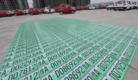12月12日,鄭州機(jī)電工程學(xué)校體育場(chǎng)上鋪滿了新能源車號(hào)牌。 視覺中國 圖