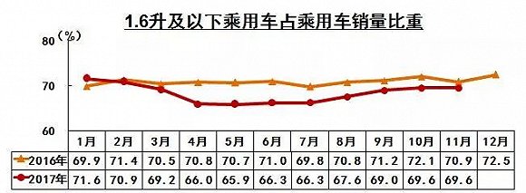 查看2017年前11月單月銷量不難發(fā)現(xiàn),除了1月銷量略高于2016年同期之外,其余月份銷量均低于2016年單月銷量。并且2017年1.6升及以下小排量乘用車總體銷量趨勢呈現(xiàn)下降態(tài)勢,僅2017年第三季度和第四季度銷量表現(xiàn)來看,單月銷量徘徊在69萬輛左右。中汽協(xié)表示1.6升及以下排量乘用車購置稅優(yōu)惠政策刺激車市的疲態(tài)已經(jīng)顯現(xiàn),從銷量來看“年終翹尾”并不會(huì)出現(xiàn)。