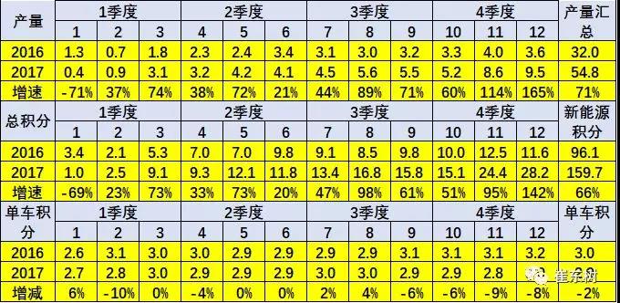 12月的新能源車生產(chǎn)9.5萬臺,形成新能源積分28.2萬分,每臺乘用車平均3分,較16年12月的3.21分下降89%。17年1-12月新能源乘用車產(chǎn)量54.8萬臺,較2016年增長71%,而新能源積分達(dá)到160萬分,較16年同期增長66%。