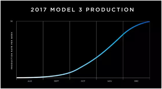 記得這張圖嘛,Musk 在發(fā)布 Model 3 的時(shí)候表示,12 月周產(chǎn)達(dá)到 5000臺(tái)??纯催@個(gè)曲線,一個(gè)典型的指數(shù)級(jí)增長(zhǎng)圖,而非線性增長(zhǎng)。特斯拉有信心實(shí)現(xiàn)這種增長(zhǎng)的原因,就在于他們這種連同生產(chǎn)工具一并進(jìn)行全新研發(fā)的思維,理論上講,這確實(shí)是符合邏輯的。