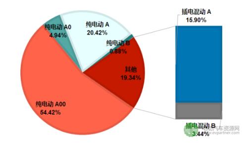 從2017年新能源乘用車細(xì)分動力類型與車型結(jié)構(gòu)看,純電動A00級車型累計銷售30.3萬臺,占比53.35%,同比累計增長173%,仍是最大的市場。